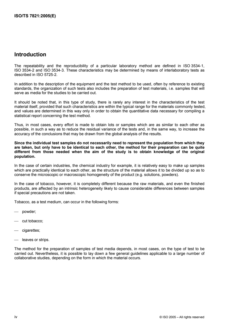 ISO/TS 7821:2005 - Tobacco and tobacco products — Preparation and constitution of identical samples from the same lot for collaborative studies for the evaluation of test methods Released:2/17/2005