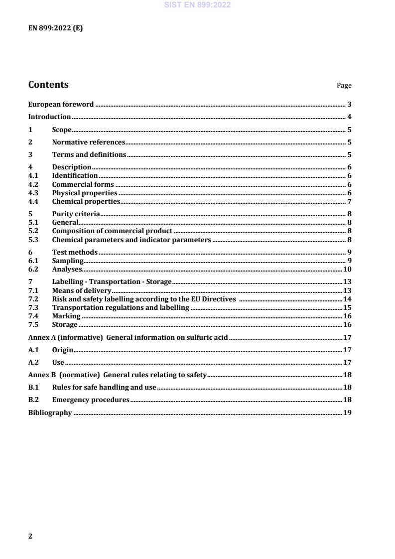 SIST EN 899:2022 is a standard published by the Slovenian Institute for Standardization (SIST). Its full title is "Chemicals used for treatment of water intended for human consumption - Sulfuric acid". This standard covers: This document is applicable to sulfuric acid used for treatment of water intended for human consumption. It describes the characteristics of sulfuric acid and specifies the requirements and the corresponding test methods for sulfuric acid. It gives information on its use in water treatment.