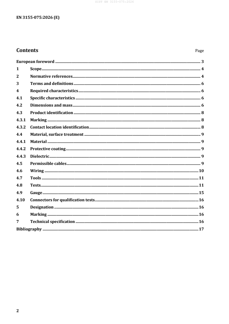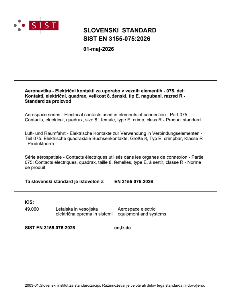 SIST EN 3155-075:2026 is a standard published by the Slovenian Institute for Standardization (SIST). Its full title is "Aerospace series - Electrical contacts used in elements of connection - Part 075: Contacts, electrical, quadrax, size 8, female, type E, crimp, class R - Product standard". This standard covers: This document specifies the required characteristics, tests and tooling applicable to female electrical quadrax contacts, shielded, size 8, type E characteristic impedance 100 Ω, crimp, class R, used in elements of connection according to EN 3155-002. It is used together with EN 3155-001. The associated male contacts are specified in EN 3155-074.