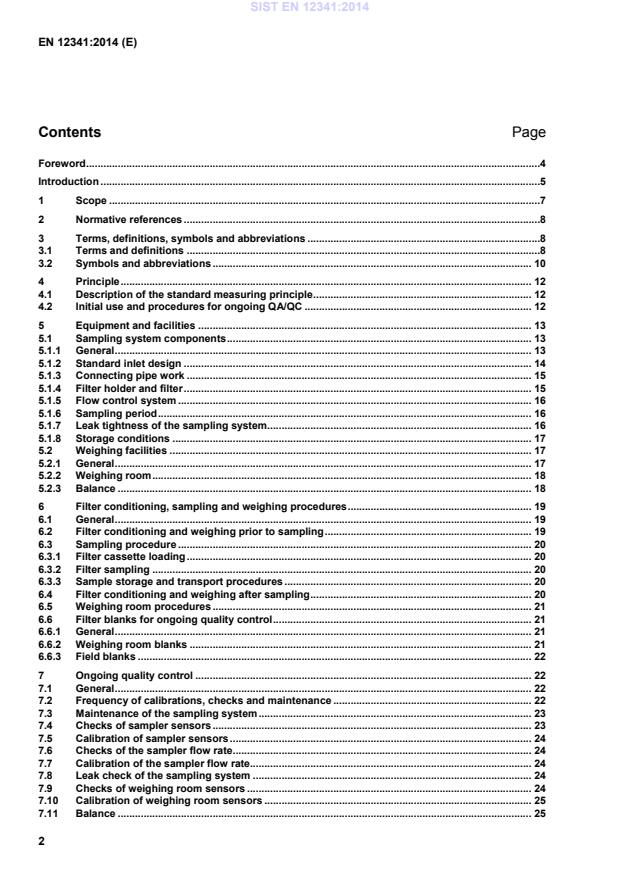 Introduction .5 1 Scope .7 2 Normative references .8 3 Terms, definitions, symbols and abbreviations .8 3.1 Terms and definitions .8 3.2 Symbols and abbreviations . 10 4 Principle . 12 4.1 Description of the standard measuring principle . 12 4.2 Initial use and procedures for ongoing QA/QC . 12 5 Equipment and facilities . 13 5.1 Sampling system components . 13 5.1.1 General . 13 5.1.2 Standard inlet design . 14 5.1.3 Connecting pipe work . 15 5.1.4 Filter holder and filter . 15 5.1.5 Flow control system . 16 5.1.6 Sampling period . 16 5.1.7 Leak tightness of the sampling system. 16 5.1.8 Storage conditions . 17 5.2 Weighing facilities . 17 5.2.1 General . 17 5.2.2 Weighing room . 18 5.2.3 Balance . 18 6 Filter conditioning, sampling and weighing procedures . 19 6.1 General . 19 6.2 Filter conditioning and weighing prior to sampling . 19 6.3 Sampling procedure . 20 6.3.1 Filter cassette loading . 20 6.3.2 Filter sampling . 20 6.3.3 Sample storage and transport procedures . 20 6.4 Filter conditioning and weighing after sampling . 20 6.5 Weighing room procedures . 21 6.6 Filter blanks for ongoing quality control . 21 6.6.1 General . 21 6.6.2 Weighing room blanks . 21 6.6.3 Field blanks . 22 7 Ongoing quality control . 22 7.1 General . 22 7.2 Frequency of calibrations, checks and maintenance . 22 7.3 Maintenance of the sampling system . 23 7.4 Checks of sampler sensors . 23 7.5 Calibration of sampler sensors . 24 7.6 Checks of the sampler flow rate . 24 7.7 Calibration of the sampler flow rate. 24 7.8 Leak check of the sampling system . 24 7.9 Checks of weighing room sensors . 24 7.10 Calibration of weighing room sensors . 25 7.11 Balance . 25 SIST EN 12341:2014