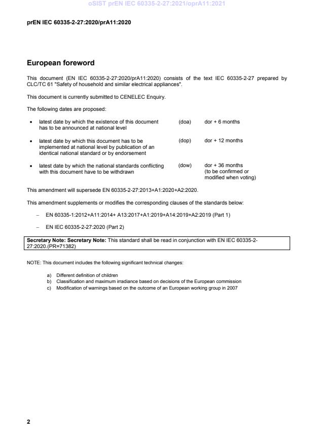 This draft amendment prA11, if approved, will modify the European Standard prEN IEC 60335-2-27:2020; it is submitted to CENELEC