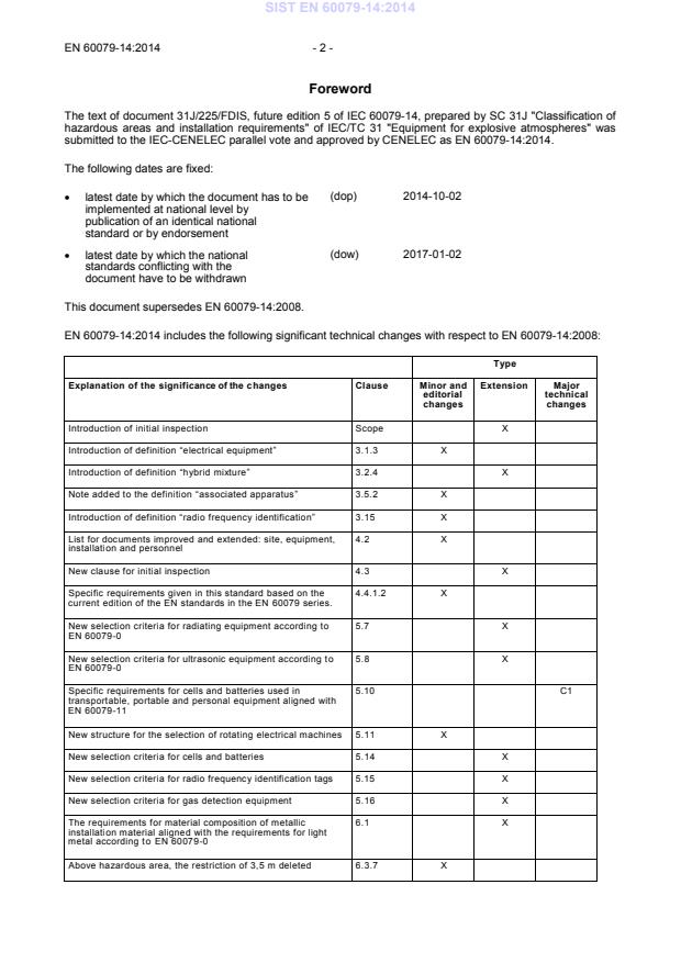 The SIST EN 60079-14:2014 standard outlines crucial requirements for the design, selection, erection, and initial inspection of electrical installations in explosive atmospheres. Its scope is well-defined, focusing exclusively on the needs associated with electrical equipment used in environments where explosive gases, vapors, or dusts are present. This standard emphasizes the necessity for adherence to safety protocols to minimize risk, particularly in locations that may encounter flammable materials. One of the significant strengths of this standard is its comprehensive coverage of both fixed and portable electrical equipment, along with installations that can be either permanent or temporary. This inclusivity ensures that diverse applications in various sectors can align their electrical installation practices with the established safety criteria. Moreover, the document addresses additional protection measures necessary for equipment exposed to environmental conditions, such as water ingress and corrosion, thus fostering a versatile approach to design and implementation. Another key aspect is the emphasis on conducting initial inspections, which serves to identify potential hazards before operations commence. The stipulated requirements drive a proactive approach to safety management in explosive atmospheres. However, it is important to note that while the standard provides a robust framework for electrical installations, it explicitly excludes considerations related to toxic risks from flammable substances at low concentrations. Users are advised to implement supplementary measures as deemed necessary for handling potentially toxic exposure, underscoring the standard’s focus on explosive risks. The fifth edition of this standard not only updates the previous version but also introduces revisions that reflect ongoing advancements in the field. Users can refer to the Foreword for detailed insights into these updates, which further strengthen the document's relevance in contemporary electrical installation practices. In summary, SIST EN 60079-14:2014 remains a pivotal reference for ensuring safety in the design, selection, erection, and initial inspection of electrical installations in explosive atmospheres, making it indispensable for professionals tasked with managing such environments.