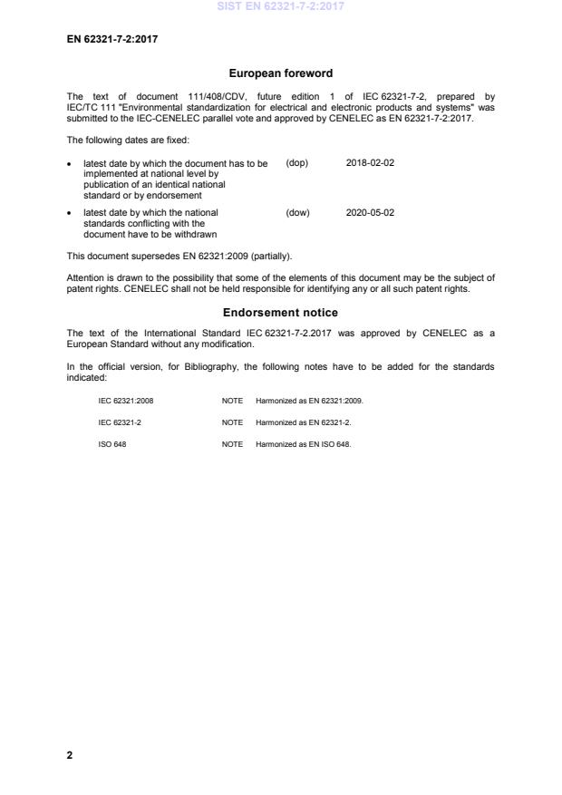 8) Attention is drawn to the Normative references cited in this publication. Use of the referenced publications is indispensable for the correct application of this publication. 9) Attention is drawn to the possibility that some of the elements of this IEC Publication may be the subject of patent rights. IEC shall not be held responsible for identifying any or all such patent rights. International Standard IEC 62321-7-2 has been prepared by IEC technical committee 111: Environmental standardization for electrical and electronic products and systems. The first edition of IEC 62321:2008 was a ‘stand-alone’ standard that included an introduction, an overview of test methods, a mechanical sample preparation as well as various test method clauses. This first edition of IEC 62321-7-2 is a partial replacement of IEC 62321:2008, forming a structural revision and generally replacing Annex C. IEC 62321-7-2 is the final replacement part of the corresponding clauses in IEC 62321:2008. SIST EN 62321-7-2:2017