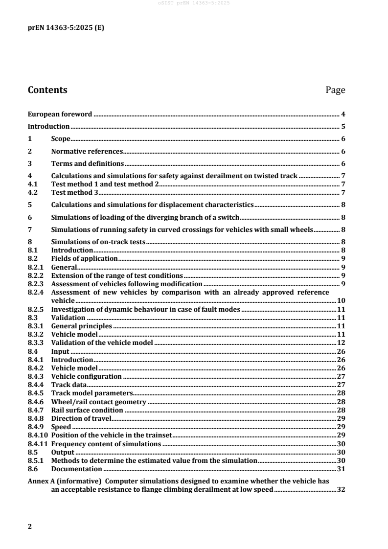 The oSIST prEN 14363-5:2025:2025 is a European standard developed by CEN that focuses on the calculations and simulations for the acceptance of running characteristics of railway vehicles operated on the heavy rail network. Specifically, it addresses methods to replace or support physical testing of running safety and dynamic behavior through validated computational models. This standard complements parts 1 through 4 of the EN 14363 series, collectively ensuring comprehensive assessment of railway vehicle dynamics and safety.