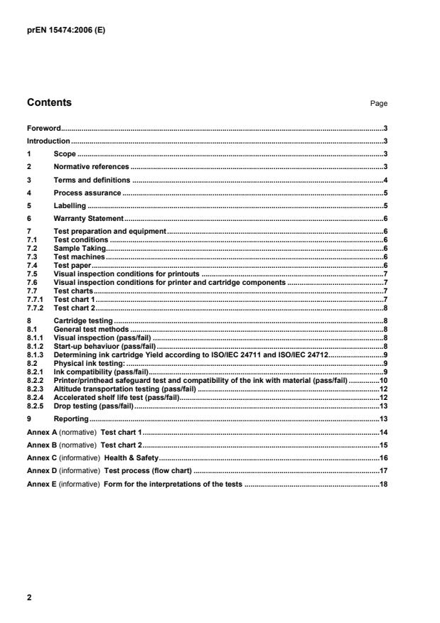 oSIST prEN 15474:2006 is a draft published by the Slovenian Institute for Standardization (SIST). Its full title is "Minimum requirements for remanufactured and compatible cartridges to safeguard proper interaction with inkjet printer systems". This standard covers: This standard applies to remanufactured and compatible ink cartridges for operation in a typical office environment. The objective of the standard is to provide two areas for common testing: 1. Provide test methodologies to assess potential cartridge/ink interactions with the printer/printhead and to safeguard the continuous functioning of the printer and printhead. 2. Measurement of yield No other claims can be made from this testing regarding image quality, reliability, etc. In general throughout the text, only printers and prints are mentioned for the purpose of simplification. Nevertheless this standard also applies to copiers, fax machines and multifunction machines as well as to the copies and facsimiles produced by them however the methods described in this standard are for use on the digital input printing part of any of these systems.