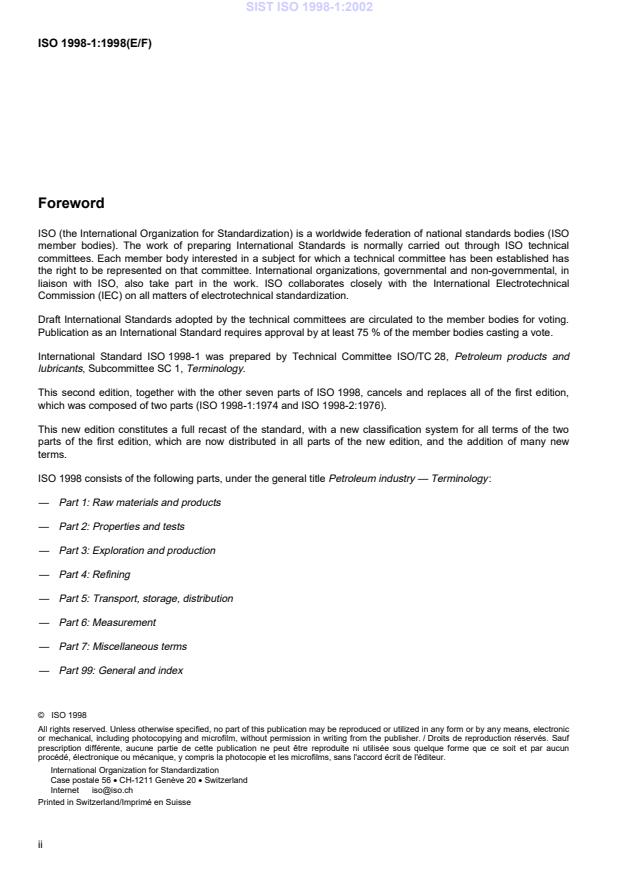 ISO 1998-1:1998 - "Petroleum industry - Terminology - Part 1: Raw materials and products" is an international terminology standard published by ISO. It provides a bilingual (English/French) list of petroleum industry terms and their definitions related to raw materials and petroleum products, covering the chain from production to final user. This second edition is a full recast of earlier editions, introduces a new classification/numbering system and many additional terms, and was prepared by ISO/TC 28 (Petroleum products and lubricants), Subcommittee SC 1 (Terminology).