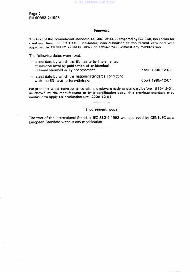 36B(CO)8836B(CO)92Full information on the voting for the approval of this standard can be found in the reporton voting indicated in the above table.IEC 383 consists of the following parts, under the general title: Insulators for overheadlines with a nominal voltage above 1000 V.–Part 1: Ceramic or glass insulator units for a.c. systems – Definitions, test methodsand acceptance criteria.–Part 2: Insulator strimps and insulator sets for a.c. systems – Definitions, testmethods and acceptance criteria.Annex A is for information only.SIST EN 60383-2:1997