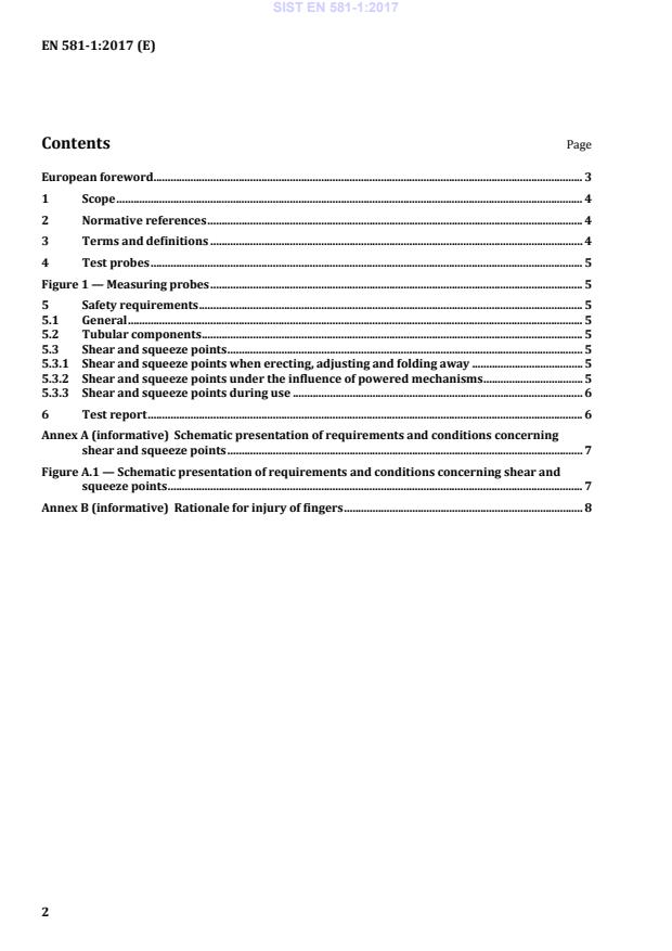 SIST EN 581-1:2017 is a standard published by the Slovenian Institute for Standardization (SIST). Its full title is "Outdoor furniture - Seating and tables for camping, domestic and contract use - Part 1: General safety requirements". This standard covers: This European Standard specifies the general safety requirements for outdoor seating and tables for adults for camping, domestic and contract use. It does not apply to removable upholstery, coverings, seating for spectator facilities, seating and tables for children. Mechanical safety requirements are covered by prEN 581-2 for seating and prEN 581-3 for tables. Annex A (informative) is a schematic presentation of requirements and conditions concerning shear and squeeze points. Annex B (informative) is a rational concerning fingers entrapment.