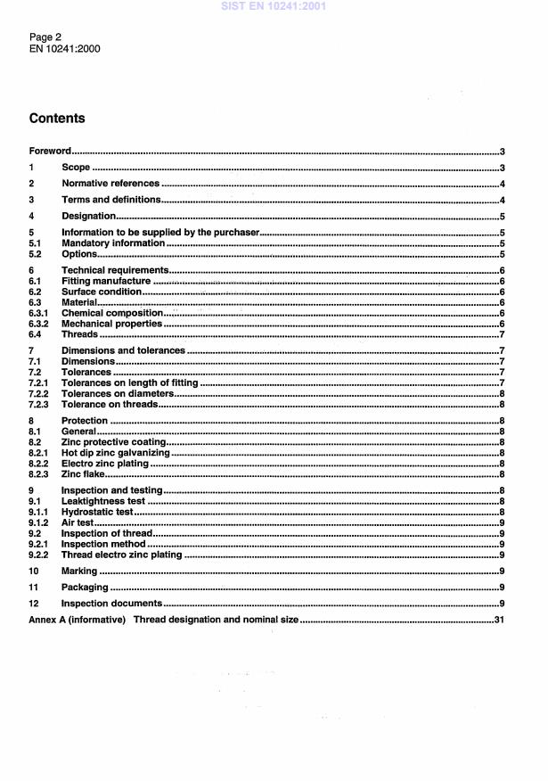 SIST EN 10241:2001 is a standard published by the Slovenian Institute for Standardization (SIST). Its full title is "Steel threaded pipe fittings". This standard covers: This European standard specifies requirements for threaded fittings of nominal sizes from DN 6 to DN 150 inclusive, made out of welded or seamless steel tubes, forging and rolled bars. It is applicable to those threaded steel pipe fittings that are used in the transportation and distribution of liquid or gas.