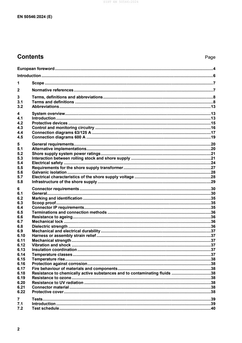 The SIST EN 50546:2024 standard presents a comprehensive framework for the three-phase shore (external) supply system specifically tailored for railway applications involving rolling stock. Its defined scope is particularly relevant in the contemporary rail infrastructure landscape, where the necessity for efficient energy management in depots and sidings is paramount. By addressing the requirements of the shore supply system for stationary rolling stock, this standard contributes significantly to enhancing the operational safety and efficiency of rail vehicles during downtime. A notable strength of the SIST EN 50546:2024 is its emphasis on safety through clearly specified requirements for both the shore supply infrastructure and the rolling stock. This dual focus ensures that operators can reliably utilize shore power without compromising safety, a critical consideration in the context of rail operations. Additionally, the standard's stipulations regarding the compatibility of class C0 and C1 train types with existing systems bolster its applicability, facilitating smoother integration with current railway setups as detailed in CLC/TS 50534:2010. The standard excels in providing detailed technical specifications necessary for the implementation of 63/125 A shore supplies, including power and control loop interfaces, which are essential for seamless operational integration. This meticulous design approach not only enhances interoperability but also mitigates potential issues such as undesirable stray currents that could adversely affect DC fed traction systems and signalling operations. By establishing these electrical characteristics, the SIST EN 50546:2024 lays a robust foundation for compliance and operational excellence in rail usage. Moreover, the explicit inclusion of intermateability requirements for 63/125 A and 600 A connectors further underscores the standard’s relevance in promoting cross-border interoperability. This is crucial in an increasingly globalized railway sector, where compatibility across different national systems is essential for efficient rail service delivery. The standard also allows flexibility by permitting the use of the shore supply system for other types of rail vehicles and applications, subject to manufacturer and customer agreement, which enhances its versatility. In summary, SIST EN 50546:2024 stands out as an indispensable reference for railway stakeholders seeking to enhance their operational frameworks with a reliable, standardized approach to shore supply systems. Its thorough guidelines significantly contribute to ensuring safety, compatibility, and interoperability, making it a pivotal document in the realm of railway applications.