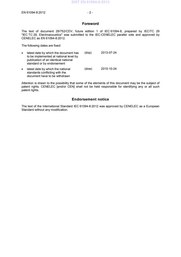 Attention is drawn to the possibility that some of the elements of this document may be the subject of patent rights. CENELEC [and/or CEN] shall not be held responsible for identifying any or all such patent rights. Endorsement notice The text of the International Standard IEC 61094-8:2012 was approved by CENELEC as a European Standard without any modification. SIST EN 61094-8:2013