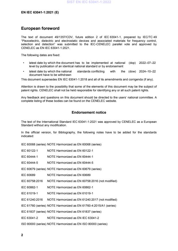 EN IEC 63041-1 links to and harmonizes with related publications (listed in Annex ZA) such as IEC 63041-2/3, IEC 60068 series (environmental testing), IEC 60444 series (measurement of piezoelectric parameters) and ISO 80000 (quantities and units). Users should consult these for complementary test methods and harmonized units.