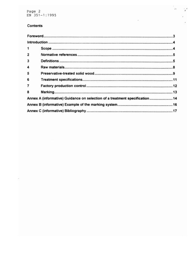 This part of EN 351 establishes a classification of preservative-treated wood in terms of preservative penetration and gives guidance on a classification of retention. These should be used as a basis for specifying preservative treatments for particular products. This part of EN 351 includes clauses on factory production control and marking.