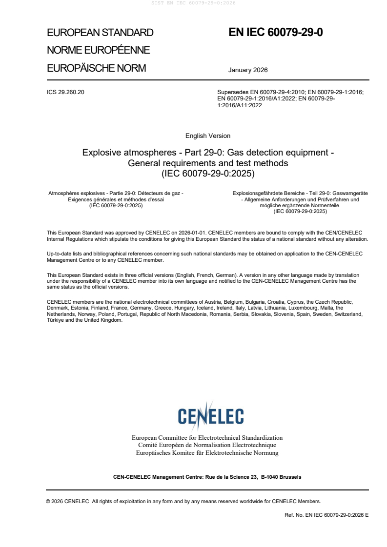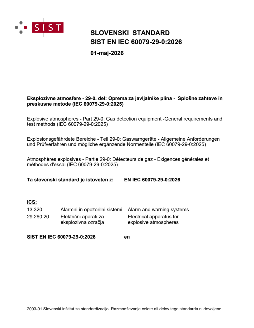 IEC 60079-29-0:2025 določa splošne zahteve, preskusne metode in sprejemljive kriterije, ki se uporabljajo za opremo za zaznavanje vnetljivih, kisikovih in strupenih plinov, namenjeno zaznavanju plinov in hlapov ter zagotavljanju indikacije, alarma ali druge izhodne funkcije za zaščito osebja ali premoženja v industrijskih in komercialnih aplikacijah.