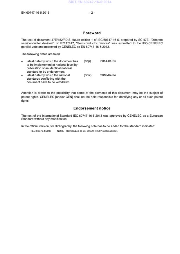 Attention is drawn to the possibility that some of the elements of this document may be the subject of patent rights. CENELEC [and/or CEN] shall not be held responsible for identifying any or all such patent rights. Endorsement notice The text of the International Standard IEC 60747-16-5:2013 was approved by CENELEC as a European Standard without any modification. In the official version, for Bibliography, the following note has to be added for the standard indicated: IEC 60679-1:2007 NOTE