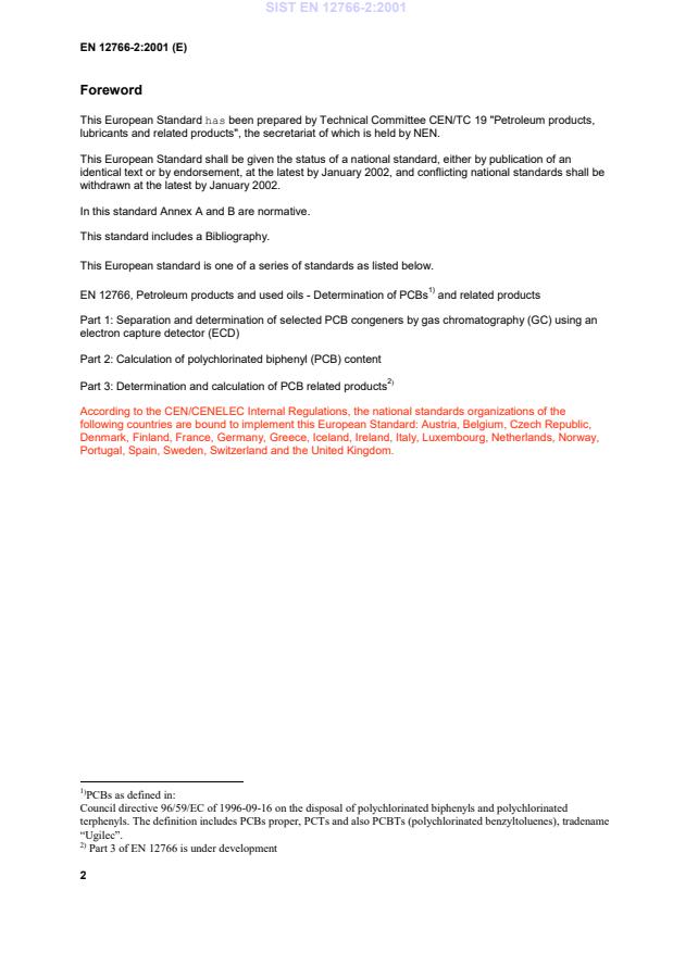 1)PCBs as defined in:Council directive 96/59/EC of 1996-09-16 on the disposal of polychlorinated biphenyls and polychlorinatedterphenyls. The definition includes PCBs proper, PCTs and also PCBTs (polychlorinated benzyltoluenes), tradename“Ugilec”.2 Part 3 of EN 12766 is under developmentSIST EN 12766-2:2001