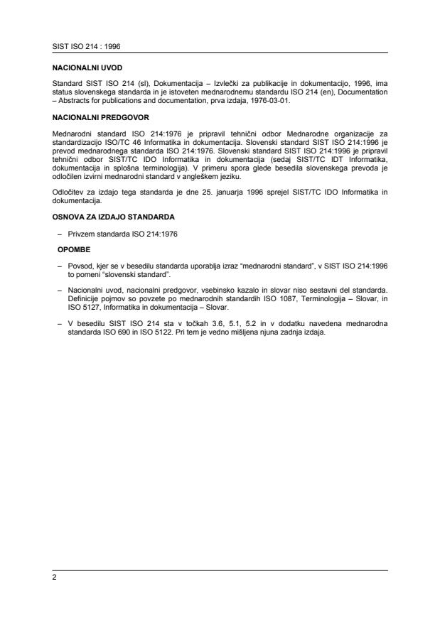 SIST ISO 214:1996 is a standard published by the Slovenian Institute for Standardization (SIST). Its full title is "Documentation -- Abstracts for publications and documentation". This standard covers: Presents guidelines for the preparation and presentation of abstracts of documents. Applies to abstracts prepared by the authors of primary documents, and to their publication, because such abstracts can be both helpful to the readers of these documents and reproducible with little or no change in secondary publications and services. The basic guidelines are also suitable for the preparation of abstracts by persons other than the authors. Cancels and replaces ISO Recommendation R 214-1961, of which it constitutes a technical revision.