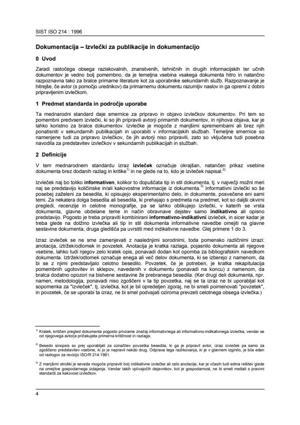 Ta mednarodni standard daje smernice za pripravo in objavo izvlečkov dokumentov. Pri tem so pomembni predvsem izvlečki, ki so jih pripravili avtorji primarnih dokumentov, in njihova objava, kar je lahko koristno za bralce dokumentov. Izvlečke je mogoče z manjšimi spremembami ali brez njih ponatisniti v sekundarnih publikacijah in uporabiti v informacijskih službah. Temeljne smernice so namenjene tudi za pripravo izvlečkov, če jih avtorji niso pripravili, zato so vključena tudi posebna navodila za predstavitev izvlečkov v sekundarnih publikacijah in službah.
