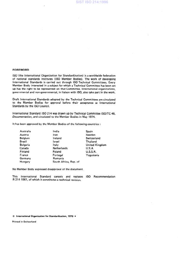 IS0 (the International Organization for Standardization) is a worldwide federation of national standards institutes (IS0 Member Bodies). The work of developing International Standards is carried out through IS0 Technical Committees. Every Member Body interested in a subject for which a Technical Committee has been set up has the right to be represented on that Committee. International organizations, governmental and non-governmental, in liaison with ISO, also take part in the work. Draft International Standards adopted by the Technical Committees are circulated to the Member Bodies for approval before their acceptance as International Standards by the IS0 Council. International Standard IS0 214 was drawn up by Technical Committee ISOnC 46, Documentation, and circulated to the Member Bodies in May 1974. It has been approved by the Member Bodies of the following countries : Australia Austria Belgium Brazil Bulgaria Canada Finland France Germany Hungary India I ran Ireland Israel Italy Netherlands Poland Portugal Romania South Africa, Rep. of Spain Sweden Switzerland Thailand United Kingdom U.S.A. U.S.S.R. Yugoslavia No Member Body expressed disapproval of the document. This International Standard cancels and replaces IS0 Recommendation R 214-1961, of which it constitutes a technical revision. 0 International Organization for Standardization, 1976 l Printed in Switzerland SIST ISO 214:1996