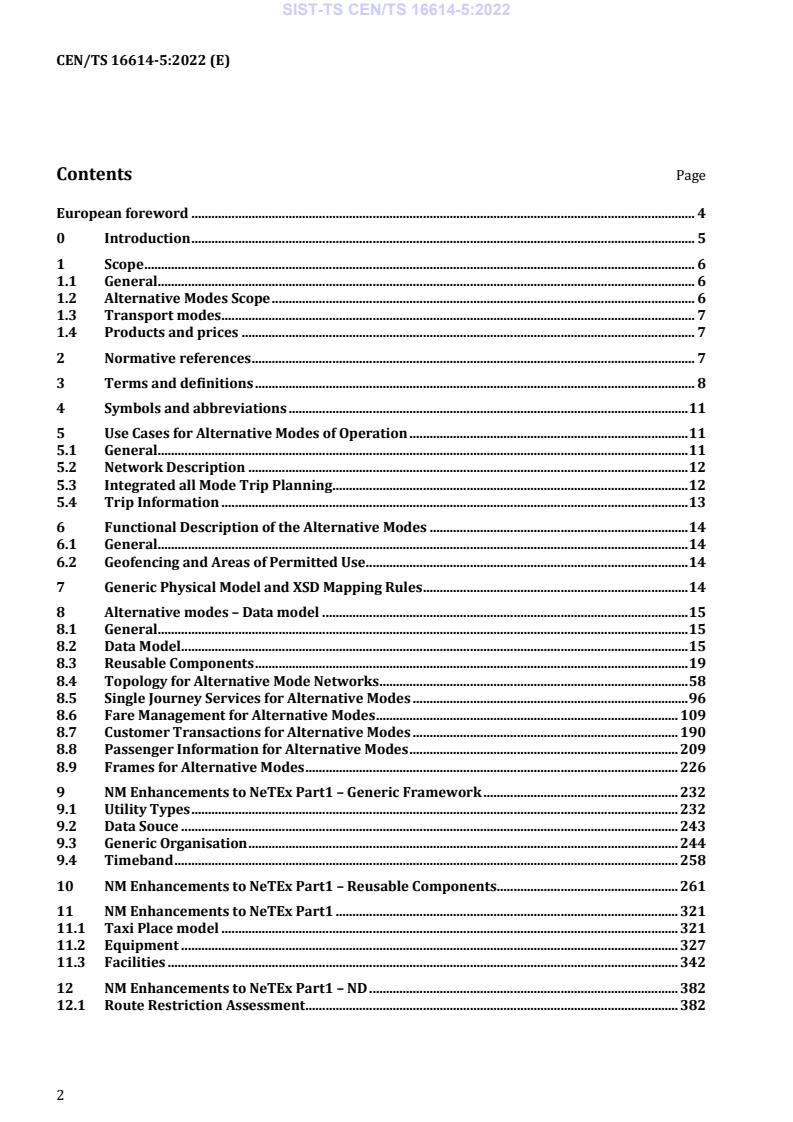 SIST-TS CEN/TS 16614-5:2022 is a technical specification published by the Slovenian Institute for Standardization (SIST). Its full title is "Public transport - Network and timetable exchange (NeTEx) - Part 5: Alternative modes exchange format". This standard covers: 1.1 General NeTEx is dedicated to the exchange of scheduled data (network, timetable and fare information). It is based on Transmodel European reference model for PT data. The most recent version of NeTEx v1.1 is based on the most recent version of Transmodel, V6.0 (EN 12986 1/2/3/4/5/6), which now incorporates the prior IFOPT (EN 28701). NeTEx also relates to SIRI (CEN 15531-1/2/3/4) and supports the exchange of information of relevance for passenger information about public transport services and also for running Automated Vehicle Monitoring Systems (AVMS). NOTE NeTEx is an implementation of a subset of Transmodel (including IFOPT); the definitions and explanations of its concepts are extracted directly from Transmodel and reused in NeTEx, sometimes with adaptations in order to fit the NeTEx context. Although the data exchanges targeted by NeTEx Parts 1 to 5 are predominantly oriented towards provisioning passenger information systems, AVMS and fare systems with data from transit scheduling systems, it is not restricted to this purpose and NeTEx can also provide an effective solution to many other use cases for transport data exchange. 1.2 Alternative Modes Scope This Part 5 of NeTEx is specifically concerned with the exchange of reference data to support “new” alternative modes for mobility services, adding certain new concepts to the NeTEx schema (indicated as NeTEx v1.2.2), but also to a high degree making use of existing schema elements defined in NeTEx Parts 1, 2 and 3. The high-level design for alternative modes support is derived from a conceptual model for alternative modes CEN PT1711 (CEN/TS 17413:2020) prepared by CEN working group TC278 WG17. This CEN Technical Specification describes a conceptual model for alternative modes as an extension to Transmodel V6.0 and based on a detailed set of use cases taken from CEN PT1711 and given in Appendix A. The NeTEx format is concerned with a subset of the use cases for reference data (real-time use cases are covered by dynamic protocols such as SIRI and DATEX II). Overall, it is concerned with data for the following purposes: - to be able to integrate legs made on alternative modes with conventional mode legs in seamless trip plans; - to describe the coverage areas of alternative mode mobility services so that trip planning engines and others can make passengers aware of the possibility of using them, and provide appropriate links to invoke the dynamic services; - to be able to find the locations of access points for alternative mode services, such as parking points, pooling stations, etc. including their relation to access points for conventional modes; - to be able to indicate the costs of the mobility services for specific trip legs. Where operators offer a bundle of modes services (for example free cycle use with metro use) to be able to include the “fare product” for alternative mode legs in the sales offer; - to be able to indicate how to book, purchase and pay for mobility services, and how to access them. NeTEx is primarily concerned with the exchange of reference data to allow the integration of new modes with other data; it does not describe dynamic services. The PT1711 specification indicates the nature of some of these services such as trip planning. 1.3 Transport modes All mass public transport modes are taken into account by NeTEx, including train, bus, coach, metro, tramway, ferry, air, and their submodes. Such modes are provided by transport operators, who may operate one or more modes. NeTEx part 5 widens the concept of an operator to include providers of other forms of transport, and introduces the separate concept of a “mode of operation” to classify the way services are provided: conventional, flexible, pooling, sharing, etc. ...