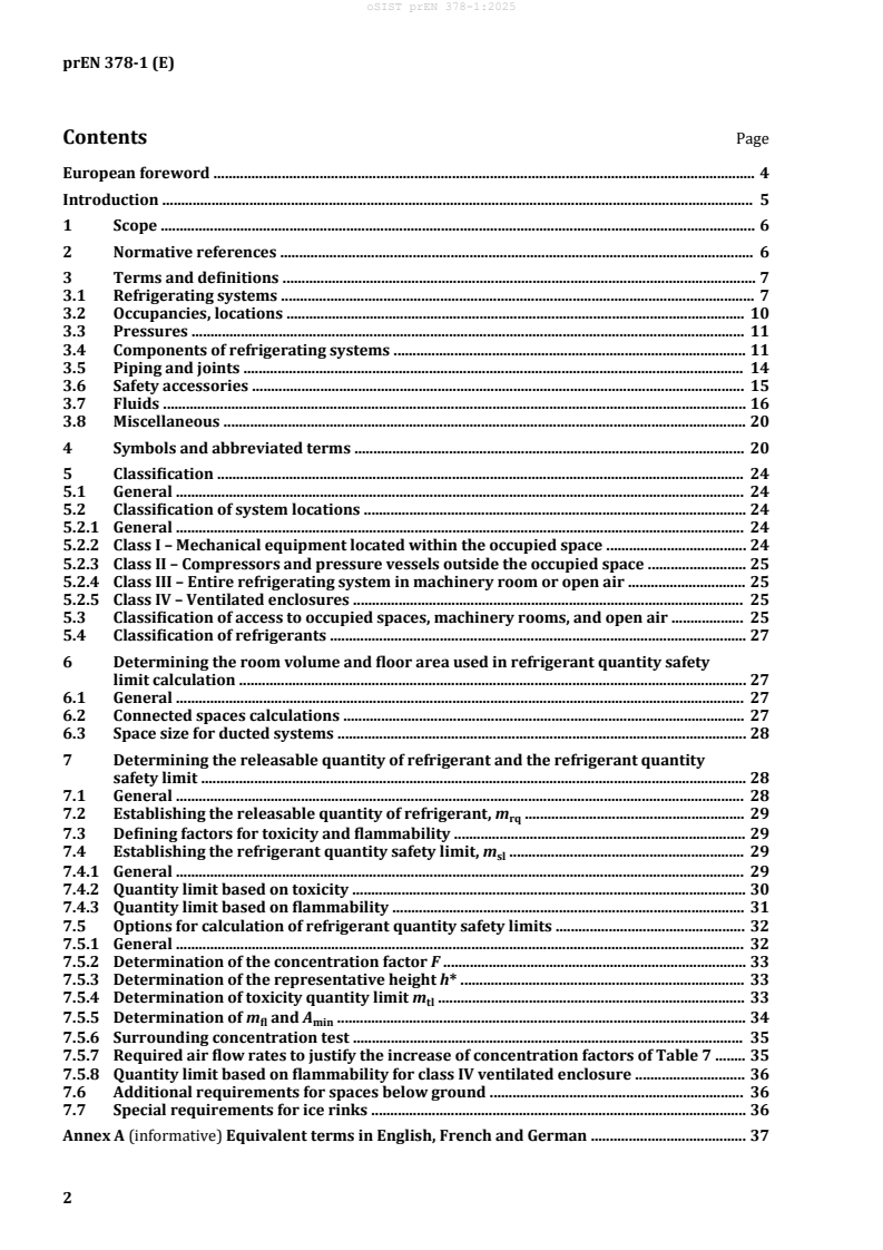 oSIST prEN 378-1:2025 is a draft published by the Slovenian Institute for Standardization (SIST). Its full title is "Refrigerating systems and heat pumps - Safety and environmental requirements - Part 1: Basic requirements, definitions, classification and selection criteria". This standard covers: This document specifies the requirements for the safety of persons and property, provides guidance for the protection of the environment and establishes procedures for the operation, maintenance and repair of refrigerating systems and the recovery of refrigerants. The term “refrigerating system” used in this document includes heat pumps. This part of EN 378 specifies the classification and selection criteria applicable to refrigerating systems. These classification and selection criteria are used in Parts 2, 3 and 5. This document applies to: a) refrigerating systems, stationary or mobile, of all sizes except to vehicle air conditioning systems covered by a specific product standard e.g. [7] b) secondary cooling or heating systems; c) the location of the refrigerating systems; d) replaced parts and added components after adoption of this document if they are not identical in function and in the capacity. Systems using refrigerants other than those listed in Part 5 of this standard are not covered by this document. Clause 7 specifies how to determine the refrigerant quantity safety limit in a given space, which, when exceeded, requires additional protective measures to reduce the risk. This document is not applicable to refrigerating systems which were manufactured before the date of its publication as a European Standard except for extensions and modifications to the system which were implemented after publication. This document is applicable to new refrigerating systems, extensions or modifications of already existing systems, and for existing stationary systems, being transferred to and operated on another site. This document also applies in the case of the conversion of a system to another refrigerant type, in which case conformity to the relevant clauses of Parts 1, 2, 3 and 5 of the standard is expected to be assessed. Product family standards dealing with the safety of refrigerating systems take precedence over horizontal and generic standards covering the same subject.