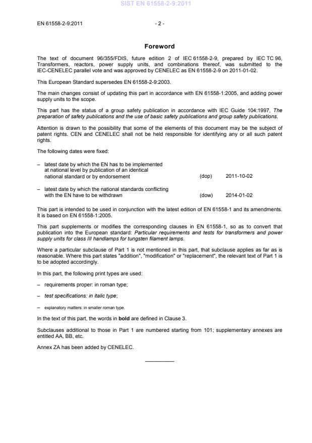 EN 61558-2-9:2011 (aligned with IEC 61558-2-9:2010) is a European/CENELEC adoption of the IEC group safety publication that sets particular requirements and tests for transformers and power supply units for class III handlamps for tungsten filament lamps. This second edition updates the original 2002 edition to align with IEC/EN 61558-1:2005 and explicitly adds power supply units (including transformers with electronic circuits) to the scope. The standard is intended to be used together with EN/IEC 61558-1 (general requirements and tests).