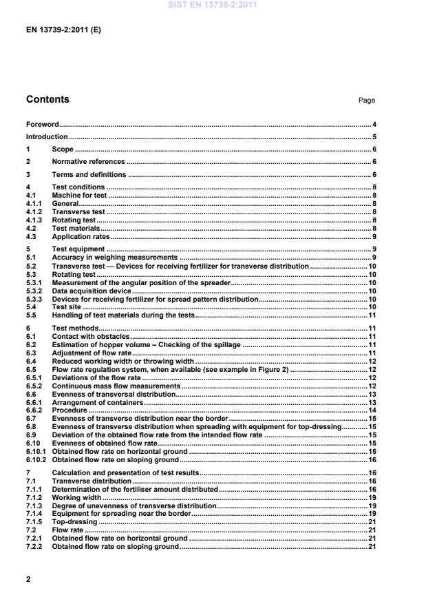 Example of a test report . 24C.1General . 24C.2Features of the fertilizer distributor . 24C.2.1General . 24C.2.2Description . 24C.2.3Dimensions and specifications . 24C.3Physical properties of test material . 27C.4Test conditions . 27C.5Test equipment . 27C.6Test results . 28C.6.1Contact with obstacles . 28C.6.2Estimation of hopper volume . 28C.6.3Adjustment of flow rate. 28C.6.4Reduced working width . 28C.6.5Flow rate regulation system . 28C.6.6Evenness of transverse distribution on level ground . 29C.6.7Evenness of transverse distribution near the border . 29C.6.8Evenness of transverse distribution when spreading with equipment for top-dressing Statistical results . 30C.6.9Deviation from intended flow rates . 30C.6.10Evenness of flow rate. 30C.7Inspections . 30C.7.1General . 30C.7.2Hopper filling opening . 31C.7.3Hopper emptying . 31C.7.4Hopper cleaning . 31C.7.5Calibration aids . 31C.7.6Feeding device . 31C.7.7Spillage . 31C.7.8Instruction handbook . 31C.8Remarks . 32Bibliography . 33