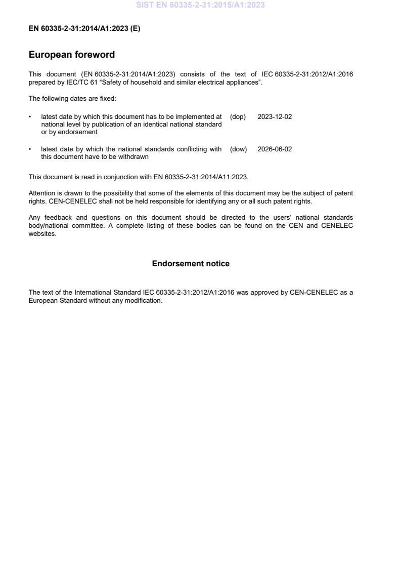 This document (EN 60335-2-31:2014/A1:2023) consists of the text of IEC 60335-2-31:2012/A1:2016