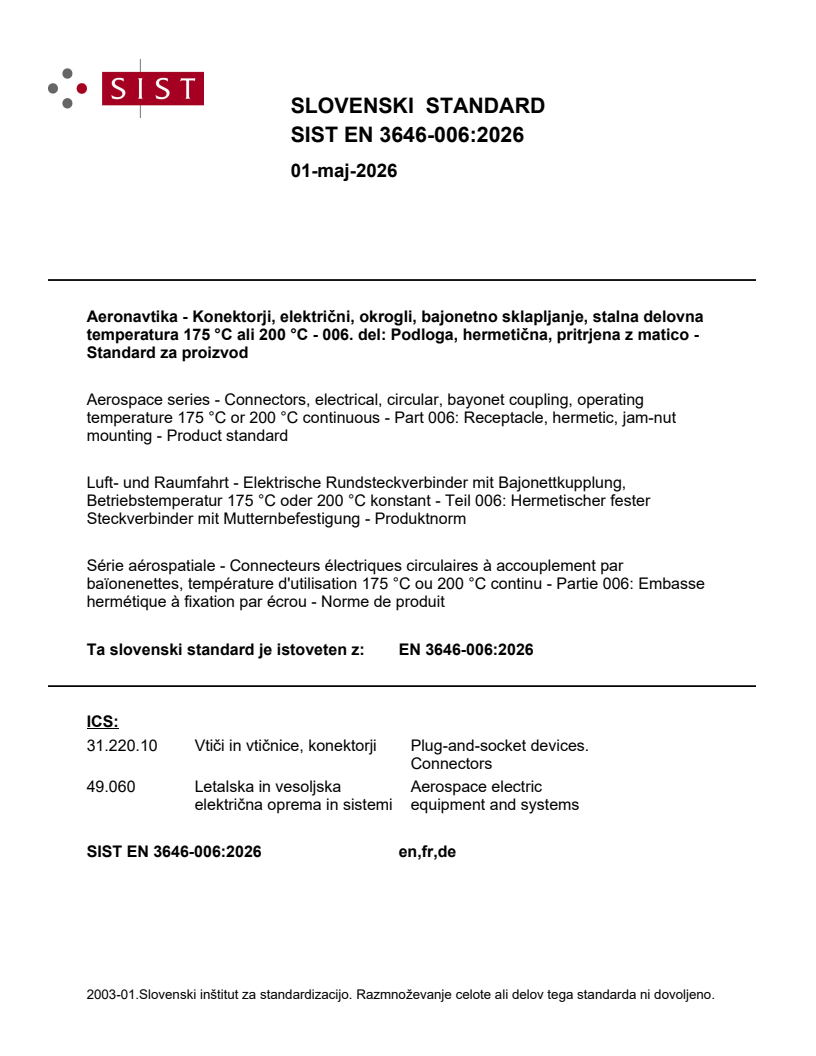 SIST EN 3646-006:2026 is classified under the following ICS (International Classification for Standards) categories: 31.220.10 - Plug-and-socket devices. Connectors; 49.060 - Aerospace electric equipment and systems. The ICS classification helps identify the subject area and facilitates finding related standards.