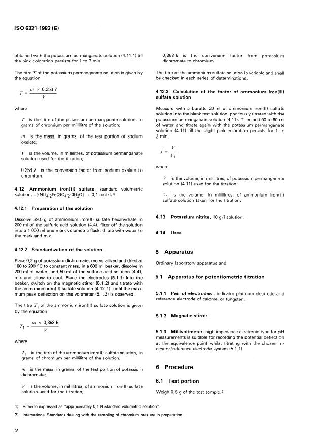 Keywords: ISO 6331, chromium ores, chromium content determination, titrimetric method, sodium peroxide fusion, ammonium iron(II) sulfate, potassium permanganate, potentiometric titration, Cr2O3 conversion.