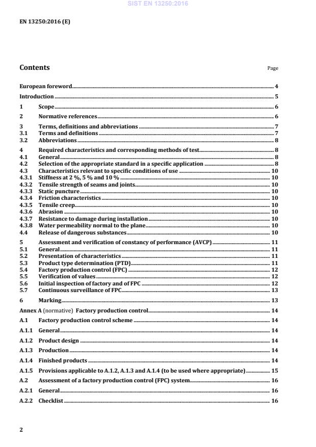 Factory production control . 14 A.1 Factory production control scheme . 14 A.1.1 General . 14 A.1.2 Product design . 14 A.1.3 Production . 14 A.1.4 Finished products . 14 A.1.5 Provisions applicable to A.1.2, A.1.3 and A.1.4 (to be used where appropriate) . 15 A.2 Assessment of a factory production control (FPC) system. 16 A.2.1 General . 16 A.2.2 Checklist . 16 SIST EN 13250:2016
