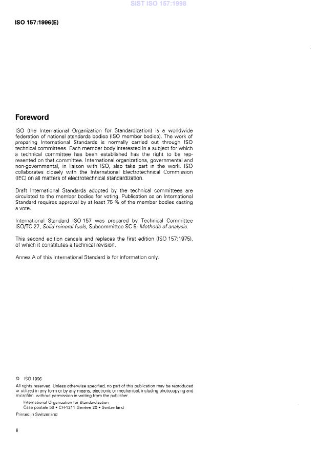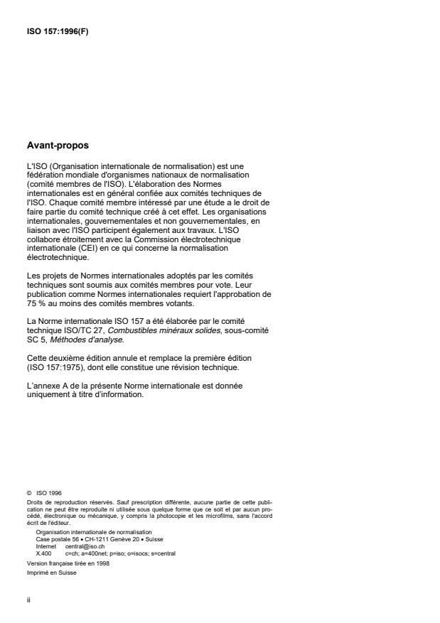 ISO 157 references and complements other ISO standards on coal sampling and sulfur analysis, for example ISO 331, ISO 334, ISO 351, ISO 1988 and ISO 5069‑2 (sample preparation and total sulfur methods). Use ISO 157 together with these sampling and total‑sulfur methods for reliable sulfur speciation in coal.