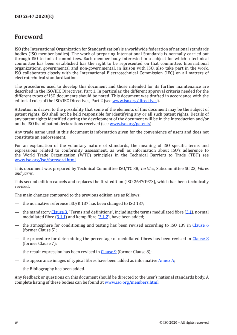 - Reporting: Test report must reference ISO 2647:2020, give total fibres examined, percentages of normal medullated and kemp fibres, deviations, and test date. Informative images of typical fibres are provided in Annex A.
