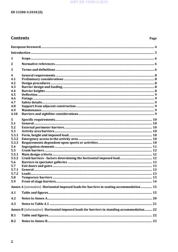 Horizontal imposed loads for barriers in standing accommodation . 22 B.1 Table and figures . 22 B.2 Notes to Annex B . 23 SIST EN 13200-3:2018