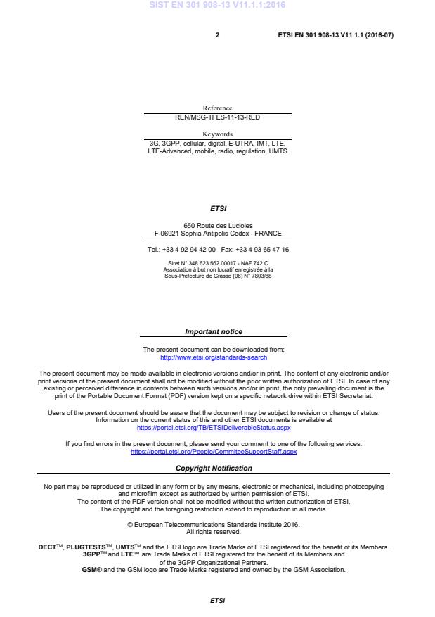 DECTTM, PLUGTESTSTM, UMTSTM and the ETSI logo are Trade Marks of ETSI registered for the benefit of its Members. 3GPPTM and LTE™ are Trade Marks of ETSI registered for the benefit of its Members and of the 3GPP Organizational Partners. GSM® and the GSM logo are Trade Marks registered and owned by the GSM Association. SIST EN 301 908-13 V11.1.1:2016