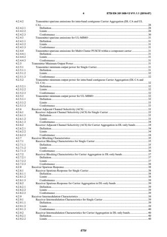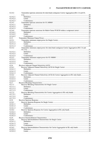 ETSI ETSI EN 301 908-13 V11.1.1 (2016-07) 4 4.2.4.2 Transmitter spurious emissions for intra-band contiguous Carrier Aggregation (DL CA and UL CA) . 28 4.2.4.2.1 Definition. 28 4.2.4.2.2 Limits . 28 4.2.4.2.3 Conformance . 30 4.2.4.3 Transmitter spurious emissions for UL-MIMO . 31 4.2.4.3.1 Definition. 31 4.2.4.3.2 Limits . 31 4.2.4.3.3 Conformance . 31 4.2.4.4 Transmitter spurious emissions for Multi-Cluster PUSCH within a component carrier . 31 4.2.4.4.1 Definition. 31 4.2.4.4.2 Limits . 31 4.2.4.4.3 Conformance . 31 4.2.5 Transmitter Minimum Output Power . 31 4.2.5.1 Transmitter minimum output power for Single Carrier. 31 4.2.5.1.1 Definition. 31 4.2.5.1.2 Limits . 32 4.2.5.1.3 Conformance . 32 4.2.5.2 Transmitter minimum output power for intra-band contiguous Carrier Aggregation (DL CA and UL CA) . 32 4.2.5.2.1 Definition. 32 4.2.5.2.2 Limits . 32 4.2.5.2.3 Conformance . 32 4.2.5.3 Transmitter minimum output power for UL-MIMO . 32 4.2.5.3.1 Definition. 32 4.2.5.3.2 Limits . 33 4.2.5.3.3 Conformance . 33 4.2.6 Receiver Adjacent Channel Selectivity (ACS) . 33 4.2.6.1 Receiver Adjacent Channel Selectivity (ACS) for Single Carrier . 33 4.2.6.1.1 Definition. 33 4.2.6.1.2 Limits . 33 4.2.6.1.3 Conformance . 34 4.2.6.2 Receiver Adjacent Channel Selectivity (ACS) for Carrier Aggregation in DL-only bands . 34 4.2.6.2.1 Definition. 34 4.2.6.2.2 Limits . 34 4.2.6.2.3 Conformance . 34 4.2.7 Receiver Blocking Characteristics . 35 4.2.7.1 Receiver Blocking Characteristics for Single Carrier . 35 4.2.7.1.1 Definition. 35 4.2.7.1.2 Limits . 35 4.2.7.1.3 Conformance . 36 4.2.7.2 Receiver Blocking Characteristics for Carrier Aggregation in DL-only bands . 37 4.2.7.2.1 Definition. 37 4.2.7.2.2 Limits . 37 4.2.7.2.3 Conformance . 38 4.2.8 Receiver Spurious Response . 38 4.2.8.1 Receiver Spurious Response for Single Carrier . 38 4.2.8.1.1 Definition. 38 4.2.8.1.2 Limits . 38 4.2.8.1.3 Conformance . 39 4.2.8.2 Receiver Spurious Response for Carrier Aggregation in DL-only bands . 39 4.2.8.2.1 Definition. 39 4.2.8.2.2 Limits . 39 4.2.8.2.3 Conformance . 39 4.2.9 Receiver Intermodulation Characteristics . 39 4.2.9.1 Receiver Intermodulation Characteristics for Single Carrier . 39 4.2.9.1.1 Definition. 39 4.2.9.1.2 Limits . 39 4.2.9.1.3 Conformance . 40 4.2.9.2 Receiver Intermodulation Characteristics for Carrier Aggregation in DL-only bands . 40 4.2.9.2.1 Definition. 40 4.2.9.2.2 Limits . 40 SIST EN 301 908-13 V11.1.1:2016
