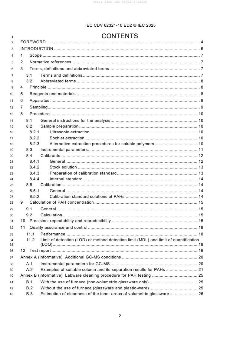 prEN IEC 62321-10:2025 defines a normative test method for the determination of polycyclic aromatic hydrocarbons (PAHs) in polymers and electronic components using gas chromatography–mass spectrometry (GC‑MS). Part of the IEC 62321 series on substances in electrotechnical products, this edition updates the extraction solvent (from dichloromethane to toluene) to reduce worker exposure and aligns laboratory practice and reporting for PAH analysis in plastics and rubbers used in electrical and electronic devices.