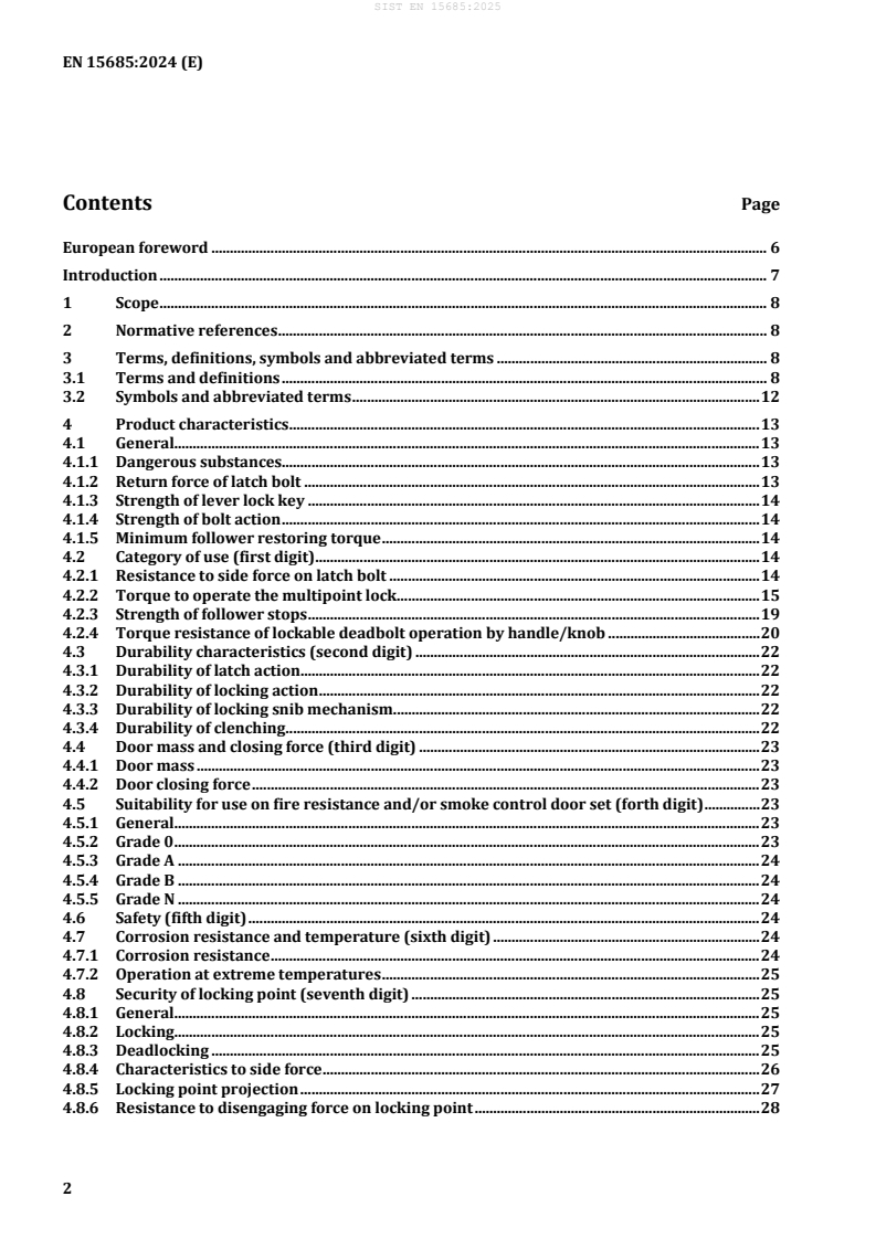 The SIST EN 15685:2025 standard provides a comprehensive framework for the requirements and test methods associated with multipoint locks and their locking plates, ensuring a robust approach to the performance and safety of these essential building hardware components. The document’s scope is well-defined, covering both locks that are manufactured as finished products by a single producer and those that consist of sub-assemblies from multiple producers, allowing for flexibility in manufacturing processes while maintaining quality control. One of the key strengths of this standard lies in its thorough specification of product characteristics and test methods. By detailing the tests that multipoint locks must undergo, the standard ensures that these products meet the necessary safety and performance benchmarks, thereby instilling confidence in their usage. This relevance is particularly critical in the context of building security, where the reliability of locking systems directly impacts overall safety. Moreover, the standard’s clear exclusions enhance its relevance by specifying what is not covered, including mechanically/electromechanically operated cylinders, window locks, padlocks, and more. This delineation helps manufacturers and users alike understand the precise context in which the standard applies, reducing ambiguity in compliance and implementation. By focusing exclusively on mechanically operated multipoint locks and their corresponding locking plates, SIST EN 15685:2025 provides targeted guidance that addresses specific market needs without overstepping into areas covered by other standards, such as EN 12209. This strategic focus contributes to its strength as a reference document for manufacturers and stakeholders in the building hardware sector. Overall, the clarity, specificity, and comprehensive nature of SIST EN 15685:2025 underline its significance in promoting safe and effective multipoint locking systems in construction and facility management.