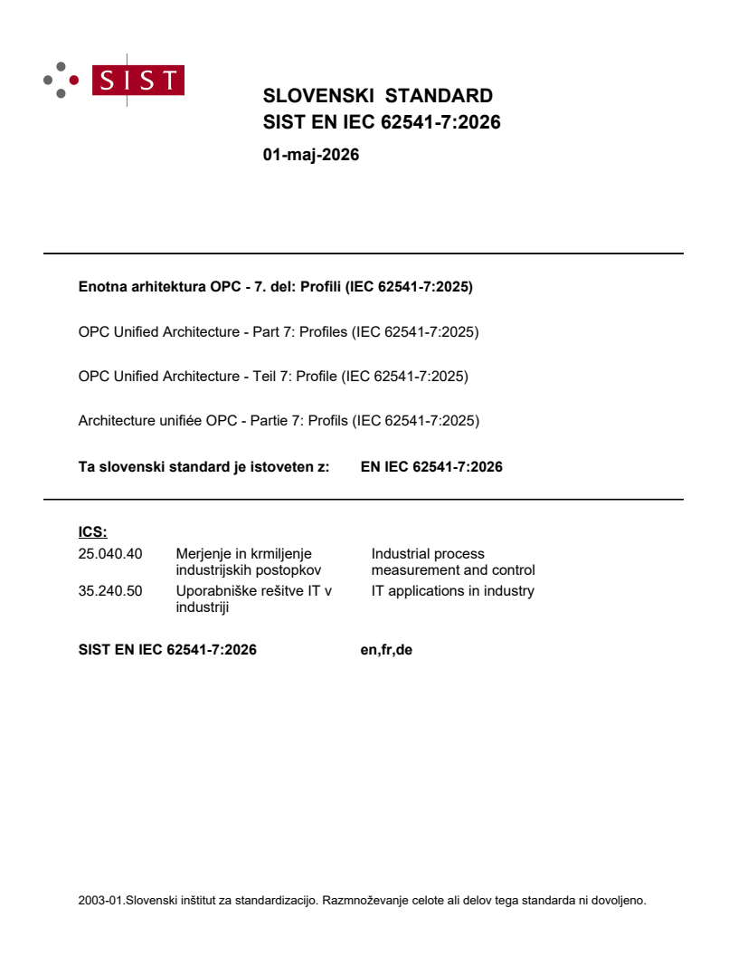 SIST EN IEC 62541-7:2026 is a standard published by the Slovenian Institute for Standardization (SIST). Its full title is "OPC Unified Architecture - Part 7: Profiles (IEC 62541-7:2025)". This standard covers: IEC 62541-7: 2025 specifies value and structure of Profiles in the OPC Unified Architecture. OPC UA Profiles are used to segregate features with regard to testing of OPC UA products and the nature of the testing. The scope of this document includes defining functionality that can only be tested. The definition of actual TestCases is not within the scope of this document, but the general categories of TestCases are covered by this document. Most OPC UA applications will conform to several, but not all of the Profiles. This fourth edition cancels and replaces the third edition published in 2020. This edition constitutes a technical revision. This edition includes the following significant technical changes with respect to the previous edition: a) Profiles and ConformanceUnits are not part of this document, but are solely managed in a public database as described in Clause 1.