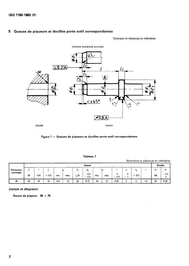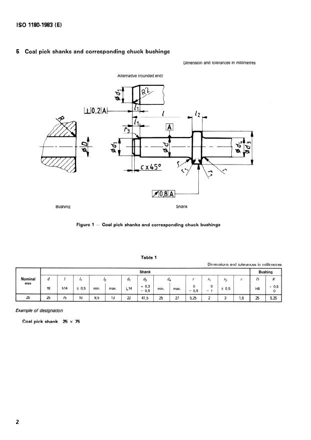 ISO 11804983 (E) 5 Coal pick shanks and corresponding chuck bushings Dimension and tolerantes in millimetres Alternative (rounded end) Bushing Shank Figure 1 - Coal pick shanks and corresponding chuck bushings Table 1 Dimensions and tolerantes in millimetres Nominal size d f8 Shank Bushing 1 jl 12 dl d3 d4 r rl r3 C D R hl4 f 0,5 min. max. &14 + 0,3 0 0 - 0,5 min. max. + 0,5 -0,5 -1 k 0,5 H8 0 25 25 75 10 93 13 22 41,5 25 27 5,25 2 3 lt6 25 5,25 Example o f designa tion Coal pick shank 25 x 75 2 SIST ISO 1180:2002