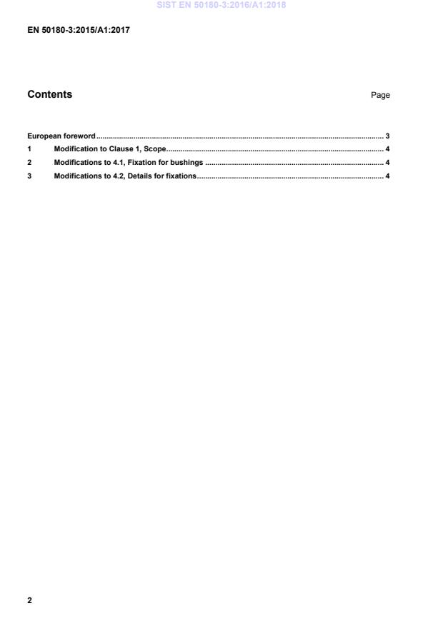 SIST EN 50180-3:2016/A1:2018 is a amendment published by the Slovenian Institute for Standardization (SIST). Its full title is "Bushings above 1 kV up to 52 kV and from 250 A to 3,15 kA for liquid filled transformers - Part 3: Requirements for bushing fixations". This standard covers: Integrate the not accepted changes of the work of WG1 proposed in the meeting on 23th October 2014 in EN50180-3