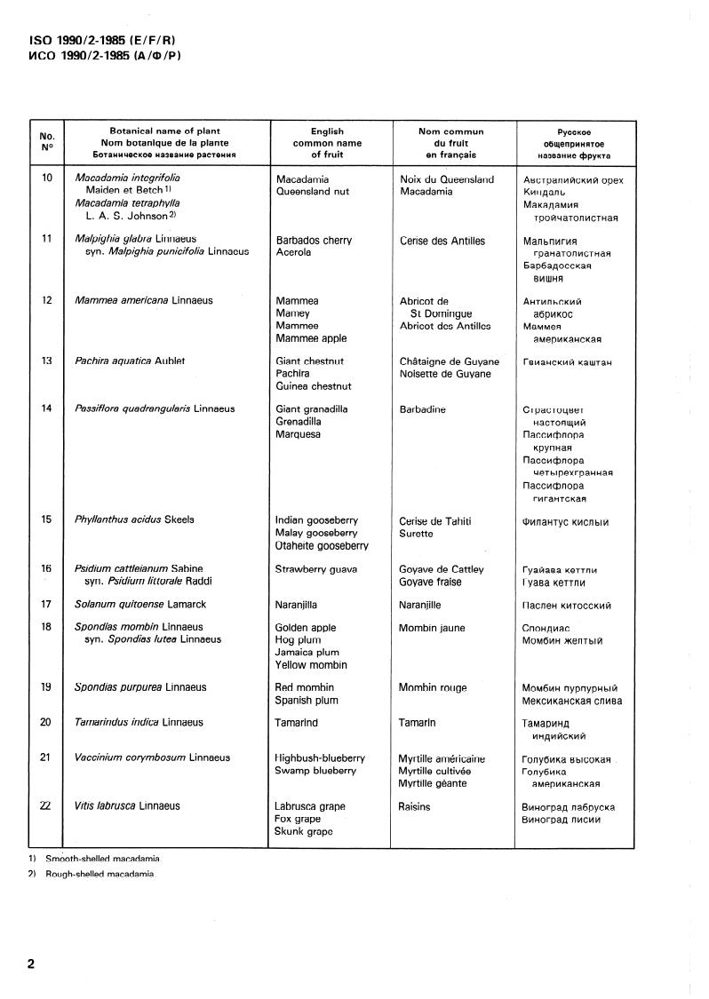 기사 제목: SIST ISO 1990-2:1996 - 과일 -- 명칭 -- 두 번째 목록 기사 내용: 이 기사는 22가지 과일 식물의 식물 이름 목록과 해당 과일의 영어, 프랑스어 및 러시아어로 된 공통 이름을 제공합니다. 또한, 세 가지 언어의 공통 이름에 대한 알파벳 순 색인도 함께 제공됩니다.
