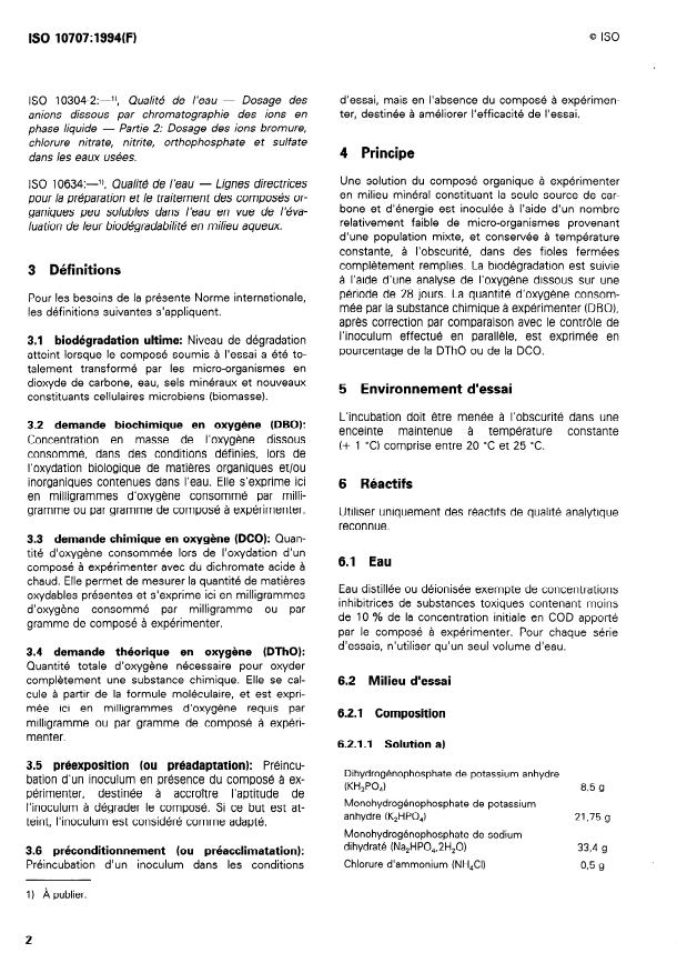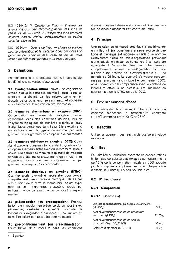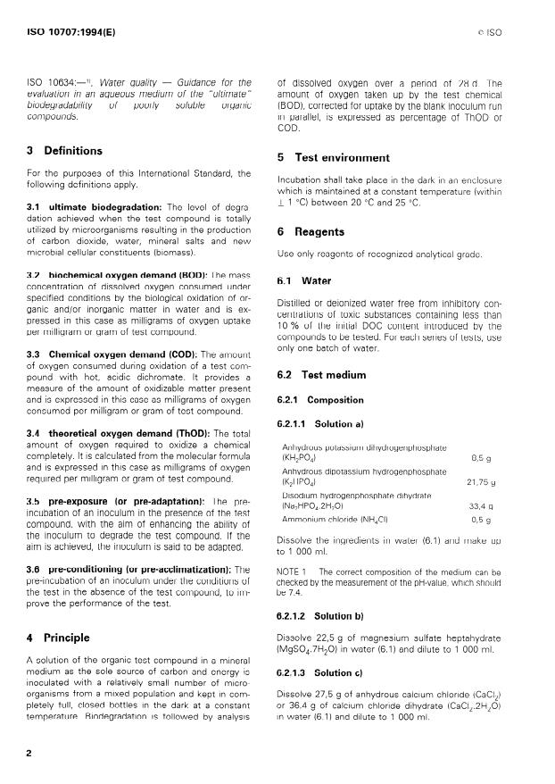 ISO 10707:1994 specifies a laboratory method - the closed bottle biochemical oxygen demand (BOD) test - for evaluating the “ultimate” aerobic biodegradability of organic compounds in an aqueous medium. The method measures oxygen uptake by aerobic microorganisms over a standard incubation period (up to 28 days) and expresses biodegradation as a percentage of the compound’s theoretical oxygen demand (ThOD) or, where ThOD is not available, as a percentage of chemical oxygen demand (COD).