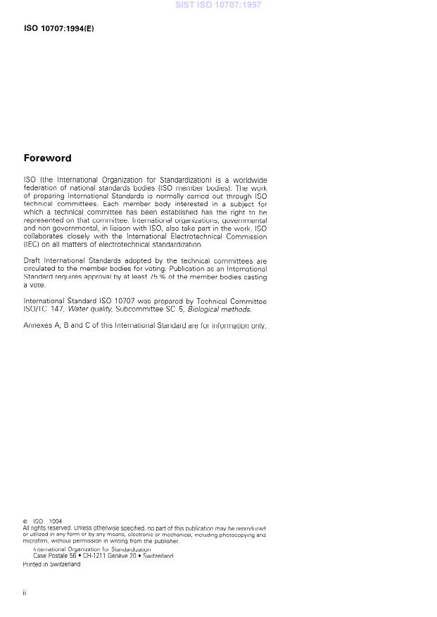SIST ISO 10707:1997 is a standard published by the Slovenian Institute for Standardization (SIST). Its full title is "Water quality -- Evaluation in an aqueous medium of the "ultimate" aerobic biodegradability of organic compounds -- Method by analysis of biochemical oxygen demand (closed bottle test)". This standard covers: Specifies a method, by analysis of biochemical oxygen demand, for the evaluation in an aqueous medium of the "ultimate" biodegradability of organic compounds at a given concentration by aerobic microorganisms. The method applies to all organic compounds which are sufficiently water soluble to prepare a stock solution or poorly water soluble when using special dosing techniques.
