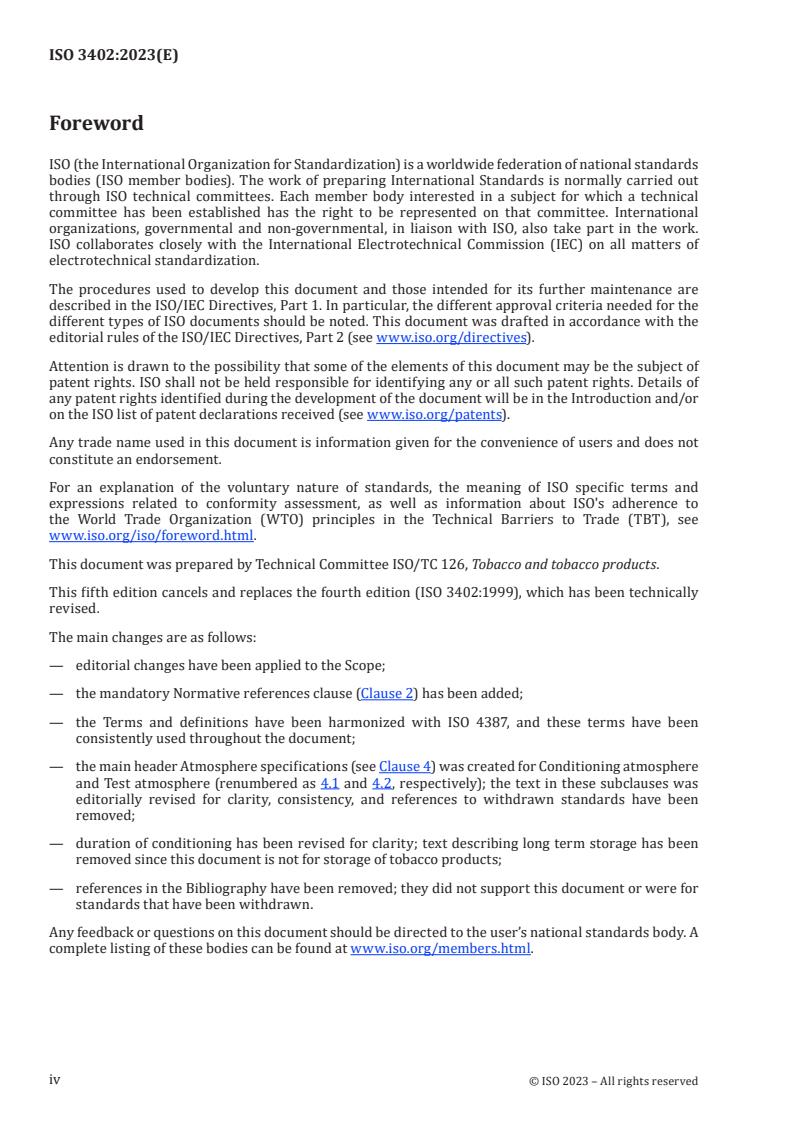 - Terminology harmonized with ISO 4387 (referenced in the document). Other ISO tobacco-testing standards may refer to ISO 3402:2023 for conditioning and test-atmosphere requirements.