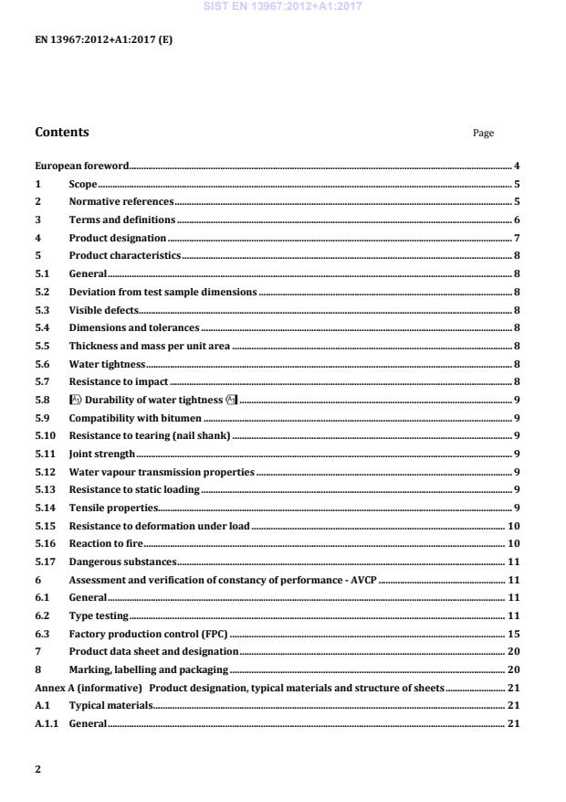 Page European foreword . 4 1 Scope . 5 2 Normative references . 5 3 Terms and definitions . 6 4 Product designation . 7 5 Product characteristics . 8 5.1 General . 8 5.2 Deviation from test sample dimensions . 8 5.3 Visible defects . 8 5.4 Dimensions and tolerances . 8 5.5 Thickness and mass per unit area . 8 5.6 Water tightness . 8 5.7 Resistance to impact . 8 5.8 !Durability of water tightness" . 9 5.9 Compatibility with bitumen . 9 5.10 Resistance to tearing (nail shank) . 9 5.11 Joint strength . 9 5.12 Water vapour transmission properties . 9 5.13 Resistance to static loading . 9 5.14 Tensile properties . 9 5.15 Resistance to deformation under load . 10 5.16 Reaction to fire . 10 5.17 Dangerous substances . 11 6 Assessment and verification of constancy of performance - AVCP . 11 6.1 General . 11 6.2 Type testing . 11 6.3 Factory production control (FPC) . 15 7 Product data sheet and designation . 20 8 Marking, labelling and packaging . 20 Annex A (informative)