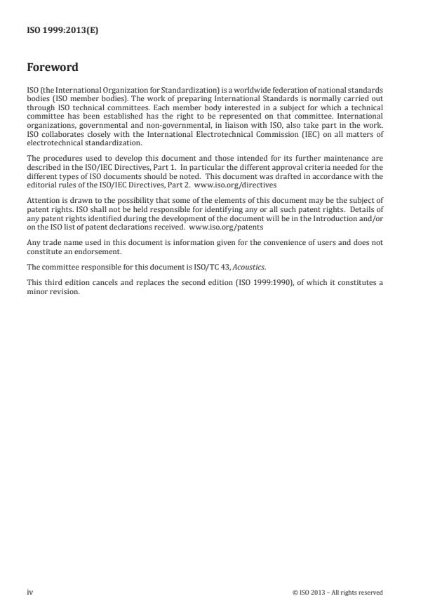 Ta mednarodni standard določa metodo za izračun pričakovanega trajnega premika praga občutljivosti zaradi hrupa v ravneh slušnega praga pri odraslih, ki so izpostavljeni hrupu z različno intenzivnostjo in trajanjem, ter daje osnovo za izračun okvare sluha v skladu z različnimi formulami, ko ravni slušnega praga pri splošno izmerjenih avdiometričnih frekvencah ali kombinaciji teh frekvenc presežejo določeno vrednost. Meritev izpostavljenosti hrupu za ogroženo populacijo je raven izpostavljenosti hrupu, normalizirana na nominalni 8-urni delovni dan (LEX, 8h) za podano število let izpostavljenosti. Ta mednarodni standard se uporablja za hrup pri frekvencah, nižjih od približno 10 kHz, ki je stalen, občasen, se spreminja in je neenakomeren. Uporaba tega mednarodnega standarda za zvočne tlake, ki presegajo 200 Pa (140 dB relativno glede na 20 μPa), se priznava kot ekstrapolacija. Predstavljene so formule za izračun izgube sluha, vključno s statistično porazdelitvijo, pri različnih avdiometričnih frekvencah zaradi izpostavljenosti hrupu kot funkcija ravni izpostavljenosti hrupu in trajanja izpostavljenosti (v letih). Formule ne razlikujejo med moško in žensko populacijo. Za izračun ravni slušnega praga in tveganja za izgubo sluha zaradi izpostavljenosti hrupu je treba izbrati primerljivo populacijo. Ta mednarodni standard vsebuje definicijo natančno pregledane populacije brez težav s sluhom (v skladu s standardom ISO 7029) in tri primere nepregledane populacije treh značilnih industrijskih družbah. Uporabniki tega mednarodnega standarda lahko izberejo primerljivo populacijo glede na lastne posebne zahteve. Ta mednarodni standard temelji na statističnih podatkih, zato ga ni mogoče uporabiti za napovedovanje ali ocenjevanje izgube sluha posameznikov, razen kar zadeva statistično verjetnost.