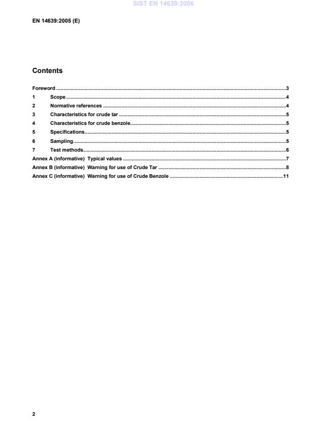 3.2 Density 20 °C 3.3 Ash value 3.4 Quinoline-insoluble content 3.5 Toluene-insoluble content 3.6 Sulphur content 3.7 Metal content 4 Characteristics for crude benzole 4.1 Water content 4.2 Density 20°C 4.3 BTEX content 4.4 Sulphur content 5 Specifications Specifications of the national standardisation organisations shall be used. The typical values given in Annex A can be used as requirements. 6 Sampling The method of sampling is described in ISO 6257. SIST EN 14639:2006