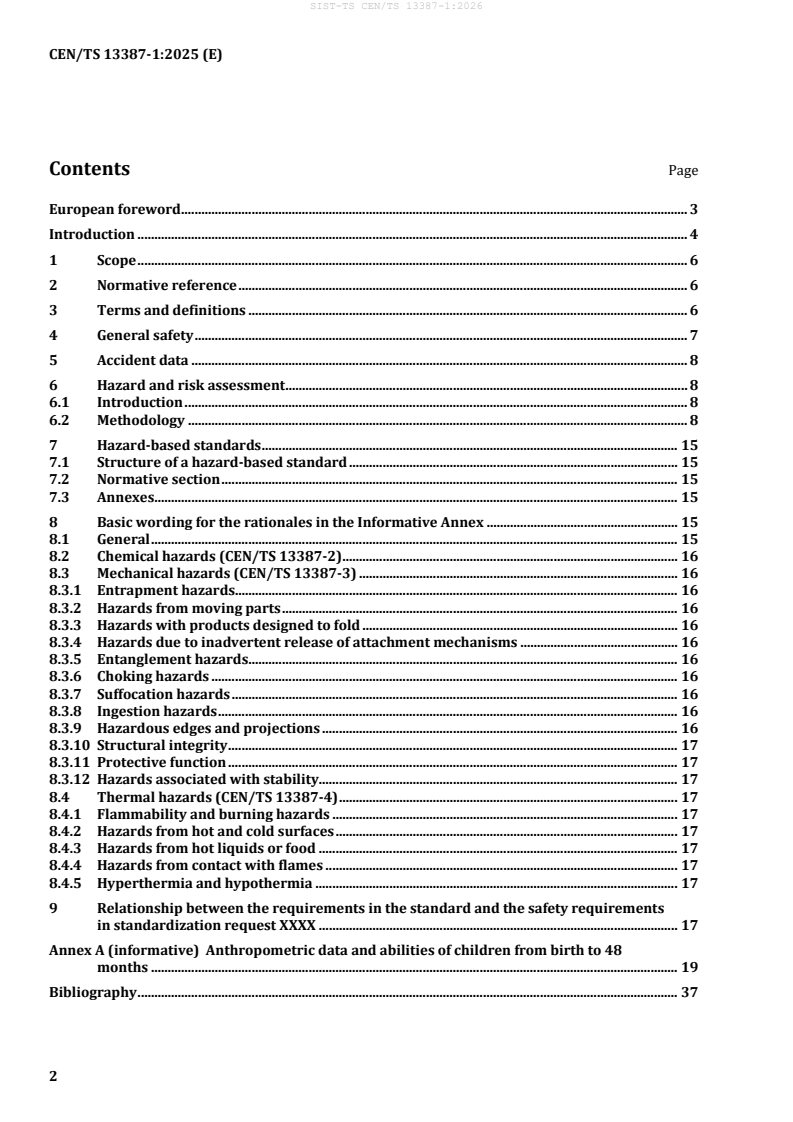 Keywords: CEN/TS 13387‑1:2025, child care articles, safety assessment, safety philosophy, anthropometric data, hazard‑based standard, risk assessment.