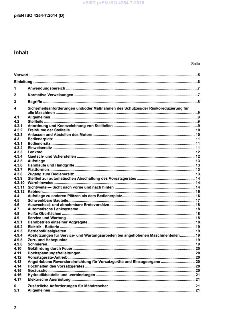 Dieses Dokument behandelt zusammen mit ISO 4254-1 alle signifikanten Gefährdungen (wie in Tabelle A.1 aufgeführt), Gefährdungssituationen und -ereignisse von Mähdreschern, Feldhäckslern, Baumwollerntemaschinen und Zuckerrohrerntemaschinen, wenn sie bestimmungsgemäß und unter den vom Hersteller vernünftigerweise vorhersehbaren Bedingungen der Fehlanwendung verwendet werden (siehe Anhang A). Es gilt nicht für Gefährdungen durch die Anwesenheit von anderen Personen als der Bedienungsperson, Reinigung des Korntanks und Gefährdungen in Bezug auf Schwingungen und bewegte Teile der Kraftübertragung, ausgenommen Festigkeitsanforderungen an Schutzeinrichtungen und Abweisbügel. In Bezug auf Bremsen und Lenkung gilt es nur für die ergonomischen Aspekte (z. B. Anordnung von Bremspedal und Lenkrad); weitere Aspekte in Bezug auf Bremsen und Lenkung sind nicht abgedeckt. Für gezogene Erntemaschinen gilt es nur für Gefährdungen im Zusammenhang mit dem Arbeitsverfahren.